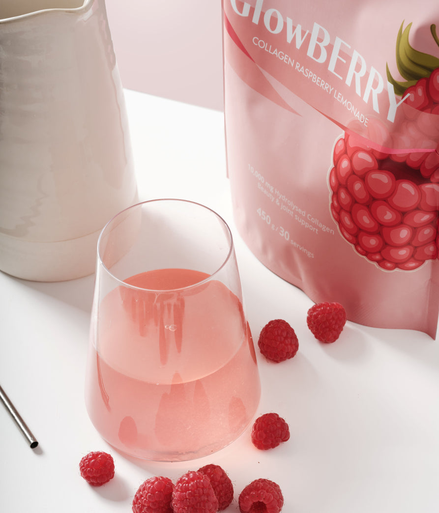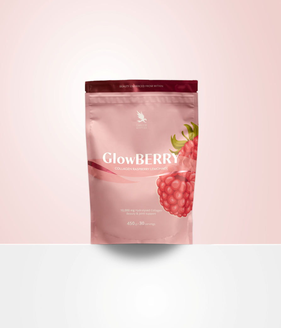 GlowBERRY ist eine erfrischende Kollagenlimonade mit Himbeergeschmack, die 10.000 mg hydrolysiertes Rinderkollagen, Hyaluronsäure, Vitamin C und Zink enthält. Vitamin C trägt zu einer normalen Kollagenbildung für die normale Funktion von Haut, Knochen und Knorpel bei, während Zink die Erhaltung gesunder Haut, Haare und Nägel unterstützt. GlowBERRY ist nicht nur ein Getränk, es ist Ihr tägliches “Self-Care-Ritual” in flüssiger Form, geschaffen für Momente, in denen Sie etwas für sich selbst, Ihre Haut und Ihr Wohlbefinden von innen heraus tun möchten.