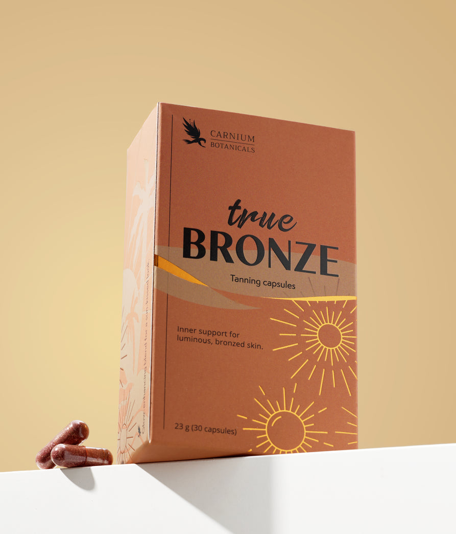 True BRONZE enthält eine sorgfältig ausgewählte Kombination natürlicher Carotinoide – Beta-Carotin, Lycopin und Astaxanthin. Beta-Carotin ist eine Vitamin-A-Quelle, die zur Erhaltung eines normalen Hautzustands beiträgt. Das bedeutet, dass es Ihre Haut genau dort unterstützt, wo es am wichtigsten ist – von innen. Egal, ob Sie sich auf den Sommer vorbereiten, der Urlaub gerade vorbei ist oder Sie auch in kälteren Monaten eine strahlende Haut wünschen – True BRONZE ist Ihre tägliche Routine für natürliche Schönheit.